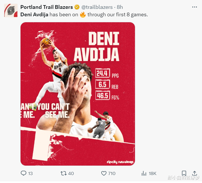 这场比赛前开拓者官方就晒出了球队第一明星阿夫迪亚前八场比赛的数据,24.4分6.5篮板4.5助攻0.8抢断0.9盖帽,命中率46.5%,三分命中率36%,阿夫迪亚已经打出全明星身手。