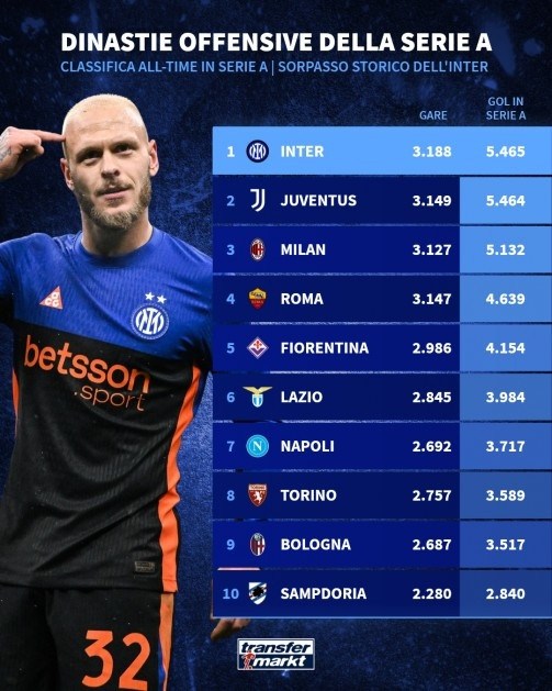 直播吧4月13日讯德国转会市场统计了各队在意甲的历史进球总数量,并列出榜单,国米打进5465球,超越尤文居首。 意甲历史进球榜(括号内为净胜球): 国米(3188)——5465 尤文(3149)——5464 AC米兰(3127)——5132 罗马(3147)——4639 佛罗伦萨(2986)——4154 拉齐奥(2845)——3984 那不勒斯(2692)——3717 都灵(2757)——3589 博洛尼亚(2687)——3517 桑普多利亚(2280)——2840 |