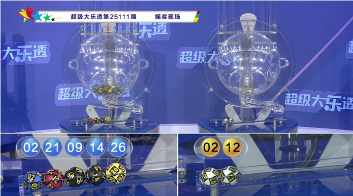 上期开奖:大乐透第2025111期开奖号码为:02、09、14、21、26+02、12。