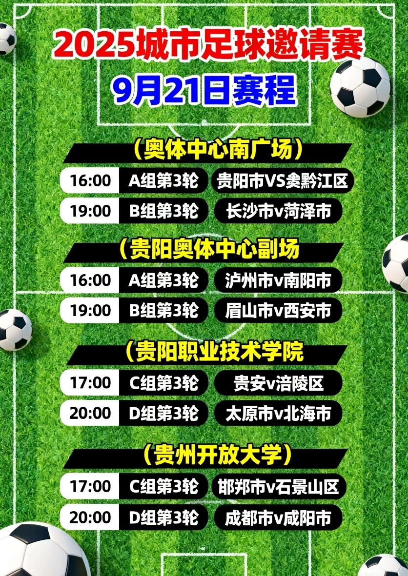 9月21日,2025城市足球邀请赛进入小组赛第三日的争夺,多场关键比赛在贵阳多个赛场同时进行,16支参赛队伍为晋级淘汰赛展开激烈争夺。 小组赛收官日赛况密集 今日小组赛共进行8场比赛,分为下午和晚间两个时段。在奥体中心南广场,16:00进行A组第三轮贵阳市对阵黔江区的比赛,晚间19:00则由B组的长沙市迎战菏泽市。同时段在奥体中心副场,A组的泸州市与南阳市于16:00交锋,B组眉山市与西安市的比赛则在19:00开球。 其他赛场同样战火激烈。贵阳职业技术学院赛场17:00进行C组贵安与涪陵区的对决,晚间20:00上演D组太原市对阵北海市的比赛。贵州开放大学赛场也迎来两场关键战,17:00C组邯郸市对阵石景山区,晚间20:00D组成都市与咸阳市展开较量。 淘汰赛赛程紧凑引人期待 随着小组赛全部结束,9月23日将立即进入更加紧张刺激的淘汰赛阶段。9月24日进行各排位赛的争夺,而整个赛事收官战定于9月25日举行。届时将从15-16名决赛开始,依次决出所有名次,最受瞩目的冠亚军决战将为本次邀请赛画上圆满句号。 本次城市足球邀请赛展现了各参赛城市足球运动的发展水平,为贵阳这座“中国足球之城”增添了新的活力。赛事组织方表示,所有比赛场地均已做好充分准备,为参赛队伍和观赛球迷提供最佳体验。 球迷可通过官方渠道获取最新比赛信息和门票详情,共同见证2025城市足球邀请赛冠军的诞生。 贵州日报天眼新闻记者朱迪 编辑罗昌 二审吴兵 三审胡丽华 |