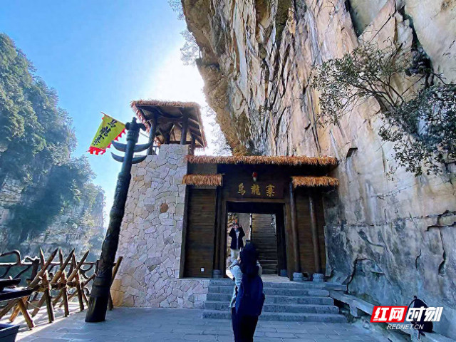 阳光斜洒的乌龙寨入口,石砌寨墙依崖而立,茅草覆顶的门楣上“乌龙寨”三字在光影里格外醒目,旁侧图腾柱与黄底寨旗随暖风舒展,古寨氛围感瞬间拉满。这处曾因险得名的“土匪寨”,如今借晴朗天气成了徒步者的“氛围感起点”。